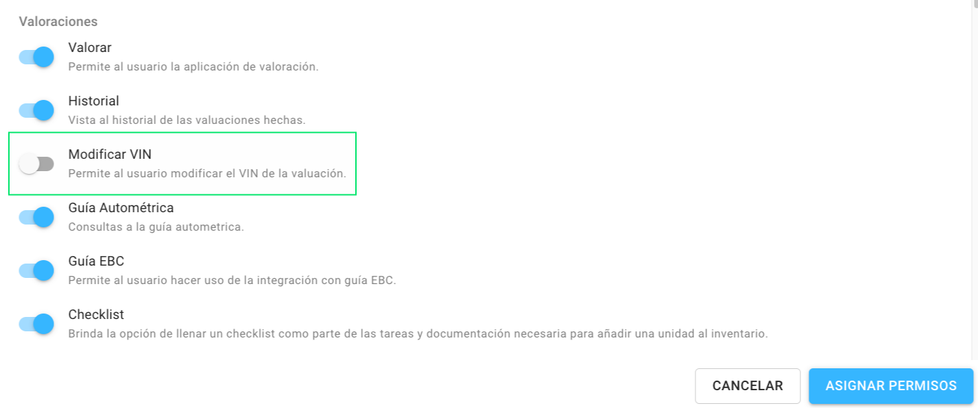 Se creó un nuevo permiso para modificar el VIN de una Valuación. Si el usuario no tiene el permiso habilitado, solo podrá agregar el VIN si nunca se puso, pero no podrá modificarlo después.