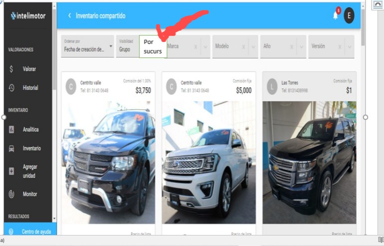 Buen Dia equipo de intelimotor, mi idea y necesidad a mejorar es incluir un botón adicional que filtre los inventarios por sucursales del mismo grupo "avanza auto", las torres , centrito valle , Humberto lobo , cumbres , barragan etc, , en la misma barra anexe una imagen ejemplo , para de esta forma tener una respuesta rápida a nuestros clientes y sea mas practica la ubicación de nuestros inventarios y disponibilidad ,
