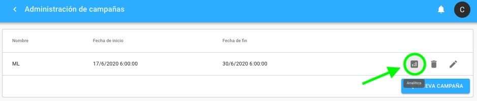 7. Al guardar la campaña que se desea analizar, podrás dar click en el icono de analítica para ver los resultados en el periodo en el que se realice la campaña.