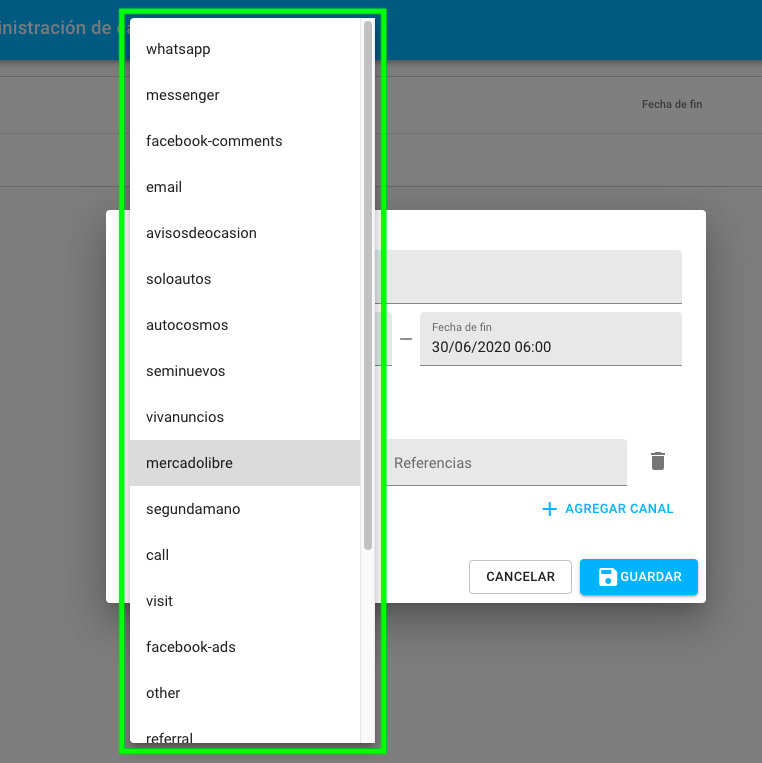 4. Al elegir el canal se despliega una lista de todas las plataformas. Dar click en el renglón de la plataforma a elegir.