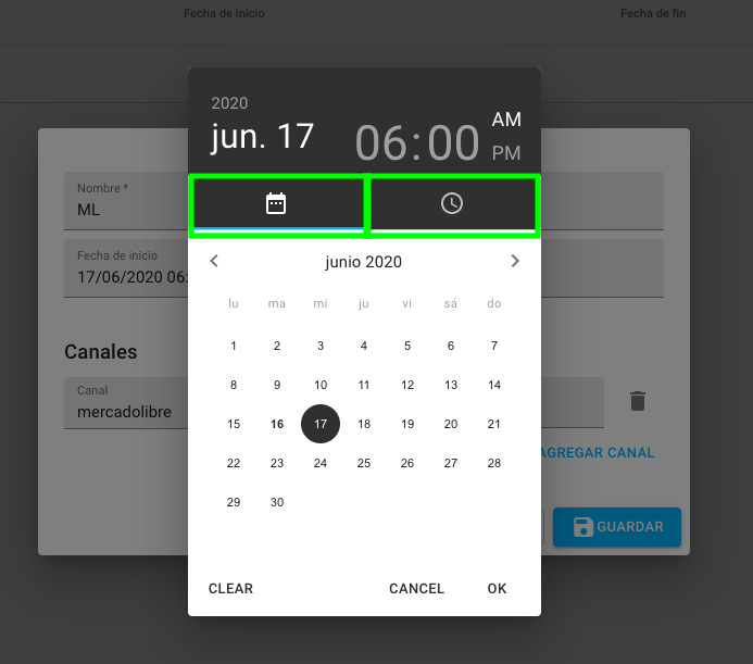 5. Al dar click en la fecha y hora de inicio y/o fin es posible editarlos.