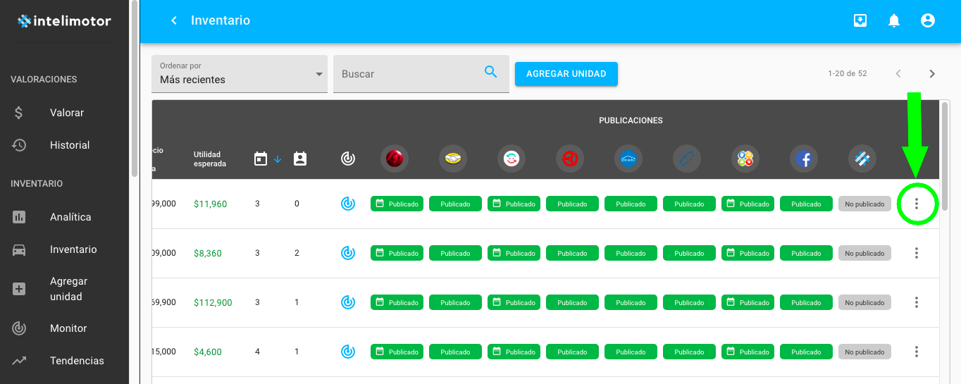 1. En el menú lateral del lado izquierdo, es necesario dar click en "inventario" para que se abra el menú principal del inventario y deslizar el menú de Intelimotor hacia la derecha para encontrar el botón de