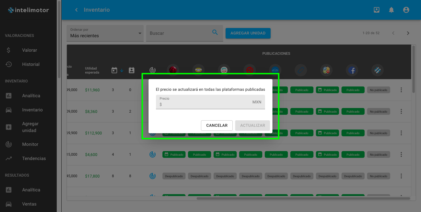 Al momento de cambiar un precio automáticamente se actualizará en todas las plataformas donde la unidad este publicada.