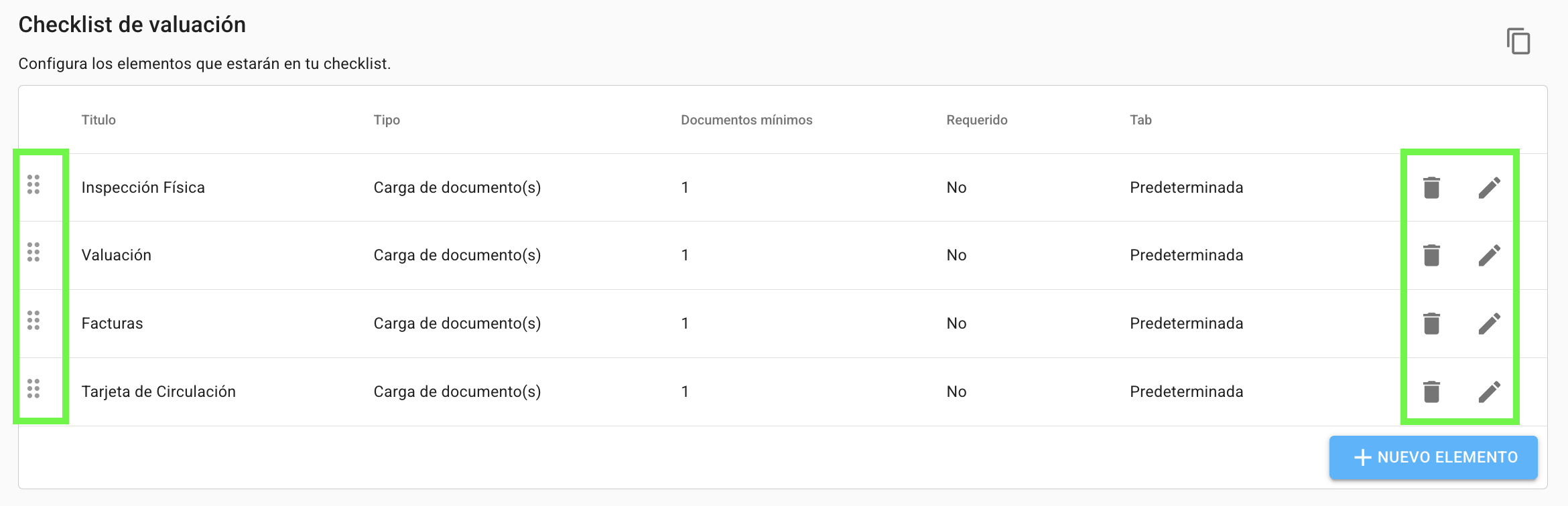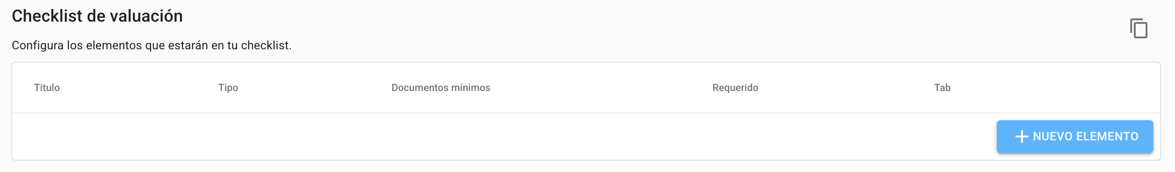 1. Desde Configuración ubica la sección "Checklist de valuación" y da click en "Nuevo elemento".